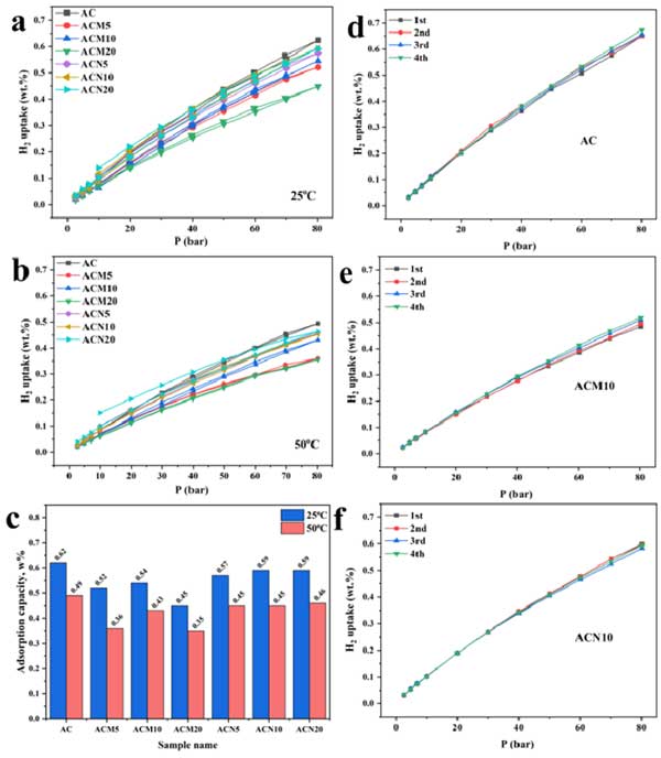 氢气储存材料在实际应用中需要具备良好的循环性能。作者对AC、ACM10、ACN10等样本进行了若干次(例如10次或更多)吸附–解吸循环测试,以评估其稳定性。原文图2d、5e、5f展示了循环曲线。