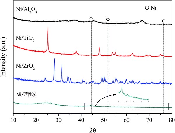 不同的Ni基催化剂的XRD图如图1所示。显示出活性炭与其他三种催化剂的特征衍射峰。在2 Ni的(111),(200)和(220)衍射峰θ=44.5°,51.8°,76.4°,分别以镍/活性炭,镍/二氧化钛和Ni/ZrO 2催化剂,表明在这些催化剂中存在具有面心立方晶格的Ni 0。Ni/Al 2 O 3,Ni/TiO 2的TEM图像,Ni/ZrO 2和活性炭(图2)也显示只有镍/活性炭由高度分散的结晶Ni颗粒组成。因此,可以说活性炭是Ni颗粒高度分散的合适载体。根据图2d中的TEM结果,发现镍/活性炭的平均粒度为约9.6nm,这与从XRD获得的微晶尺寸非常一致。