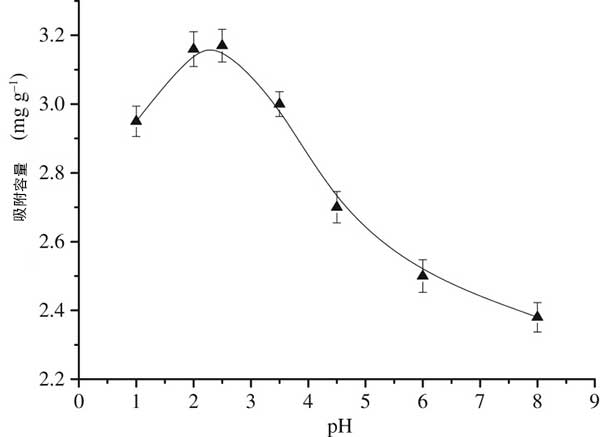 活性炭对有机物的吸附涉及复杂的反应过程。该反应不仅在吸附过程中具有简单的物理作用,而且通常还受静电,化学和络合作用的影响。pH影响存在于活性炭表面上的基团并改变表面基团的电荷,从而影响吸附过程。因此,活性炭的吸附能力在不同的pH值下表现出不同的效率。因此,吸附实验在2.1-7.5范围内的不同pH值下进行。通过H2 SO4调节溶液的pH和NaOH。