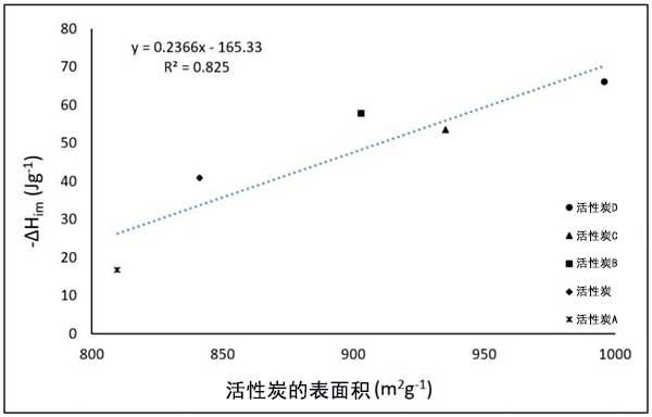 图3:作为表面积的函数,活性炭在己烷中的浸入焓。