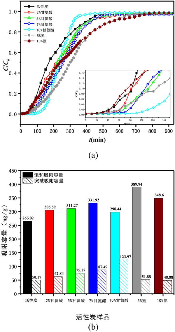 测试了选定的甲苯VOC对活性炭的吸附性能。在每个实验运行中,甲苯通过装有活性炭的吸附管直到达到平衡,即活性炭吸附剂被甲苯饱和。图2(a)所示的穿透曲线呈现为甲苯吸附量吸附(ç/ç0)与接触时间(吨,分钟)六种的活性炭正在进行中,它们的饱和和突破吸附容量如图2所示(b)。从吸附曲线可以看出,甘氨酸修饰的活性炭的穿透时间明显延长,而饱和氨改性活性炭的时间延长。活性炭上甲苯穿透吸附能力的顺序为10%甘氨酸改性活性炭>7%>5%>2%>5%氨改性活性炭>未改性活性炭>10%氨改性活性炭,而活性炭对甲苯饱和吸附容量的顺序如下:5%氨改性>10%>7%甘氨酸改性>5%>2%>10%>未改性活性炭。可见甘氨酸修饰对甲苯吸附有显着的正向影响。与原来的AC相比,甘氨酸改性的活性炭对甲苯的突破吸附能力分别提高了25%、50%、74%和147%,随着甘氨酸浓度的增加呈上升趋势。同时,甘氨酸改性的活性炭对甲苯的饱和吸附容量分别增加了15%、17%、25%和13%,且随着甘氨酸浓度的增加先增加后减少。5%和10%的氨改性也提高了甲苯的吸附性能,但其优势主要体现在饱和吸附容量上,与原来的活性炭相比,分别提高了47%和32%。