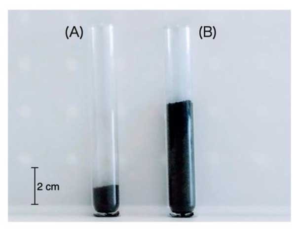 图1:未活化的活性炭原材料(A)和K2CO3活化的活性炭(B)的照片。