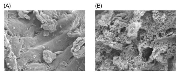 图2:未活化吸附剂(A)和活性炭(B)的SEM图像。