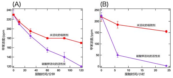 图3:在(A)120分钟和(B)24小时观察未活化吸附剂(红色)和活性炭(紫色)期间,甲苯浓度随时间的变化。