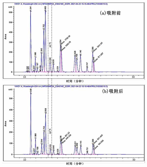图1:废水(a)吸附前和(b)吸附后的HPLC分析。