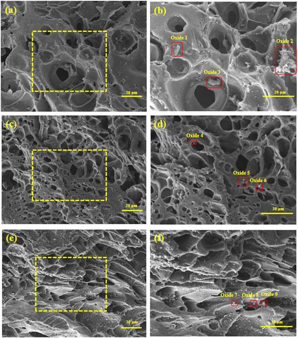 图1:活性炭载锰催化剂的SEM照片(a)5%×300,(b)5%×500,(c)7%×300,(d)7%×500,(e)9%×300,(f)9%×500。