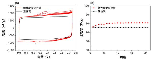 图3:(a)使用1M/H2SO4电解质并以20mV/s收集的对称纽扣电池中电极的CV曲线,箭头表示CV循环数的增加。(b)比电容随CV循环次数的变化。