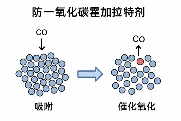 防一氧化碳霍加拉特剂的工作机制主要依靠催化反应和表面吸附相结合: