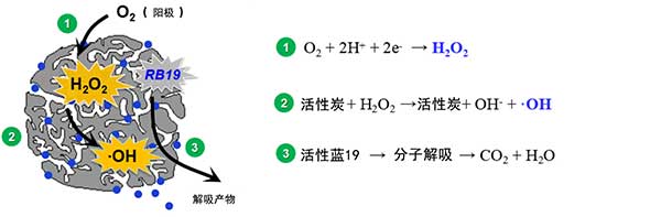 该方法的关键特征之一是没有氧化剂或催化剂外部添加到系统中。过氧化氢电生成和OH生成都发生在负极化的活性炭上。因此,RB19分子,过氧化氢分子和OH自由基处于相同位置(活性炭的孔隙和表面),这有利于短寿命OH的RB19裂解。扩大此流程的关键是活性炭与当前不锈钢网保持良好可靠的联系。这种方法可以将吸附于活性炭内的分子去除,再生活性炭的吸附能力,是一种比较好的活性炭再生方法。