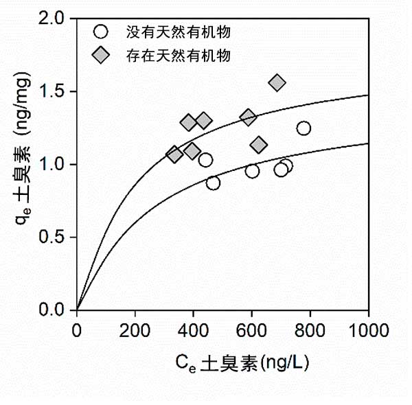 吸附平衡实验进行60分钟,这足以根据动力学研究达到吸附平衡。图3显示了在不存在和存在天然有机物质的情况下土臭素在活性炭上的吸附等温线。如图2所示,在天然有机物质存在下,吸附的土臭素的总量增加。这些结果意味着天然有机物质可以增加活性炭的吸附位点。带负电荷的天然有机物质增加,因为电排斥力,从而增加了活性炭吸附能力。