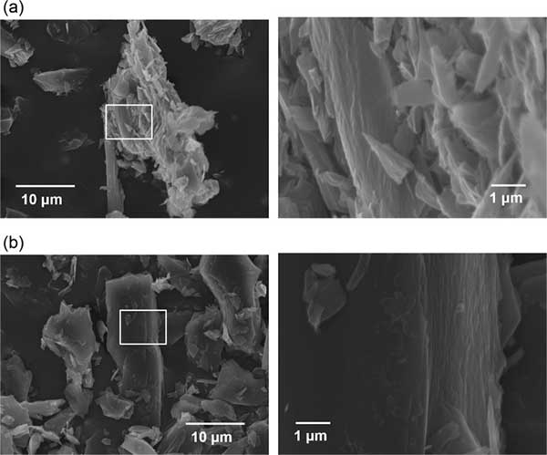 我们预测磁场对活性炭微孔形成机制的差异。在施加的磁场下,由于取向的碳聚结,碳六边形沿磁场方向形成,这种效应导致没有边界的结构。结果,由于微晶与磁场的排列,在活化过程中化学品不容易进入晶间和碳间六角层。涉及金属活化剂渗透到炭微晶中,破坏六边形结构以形成炭的边缘表面和嵌入活性炭中间层的化学物质。活性炭的扫描电子显微镜(SEM)图像显示在图4中。活性炭在没磁场的情况下,图像大多数显示出片状结构。然而,活性炭在高磁场的情况下,图像大多数显示出块形态。即使在观察活性炭堆积平面的横截面时,后者也显示出比前者更清洁的横截面,并保留了反映前体的有序结构。活化剂的比率不同会导致,活性炭形成微孔的大小。在活化剂和前体材料比率为3时,微孔数量的增加率较大。然而,在活化剂和前体材料比率为5时,微孔和相对大的孔隙之间的关系被逆转。