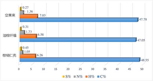 CHNS分析:在碳化和活化之前分析预处理活性炭的元素组成。图4显示了预处理样品的定量元素分析的图示。碳是所有样品中最突出的元素,棕榈仁壳,空果束和油棕纤维分别为48.55%,47.78%和47.05%。空果束含有7.03%的氢和1.36%的氮。油棕纤维含有6.58%的氢,1.73%的氮,而棕榈仁壳含有6.26%的氢和1.05%的氮。对于所有活性炭样品,硫含量不太重要,因为它们含量低于1%。