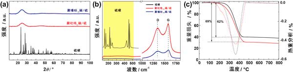 图3:硫聚吡咯活化的分级碳硫和聚噻吩活化的分级碳硫复合物的XRD衍射图和拉曼光谱。